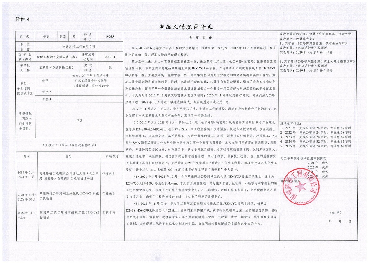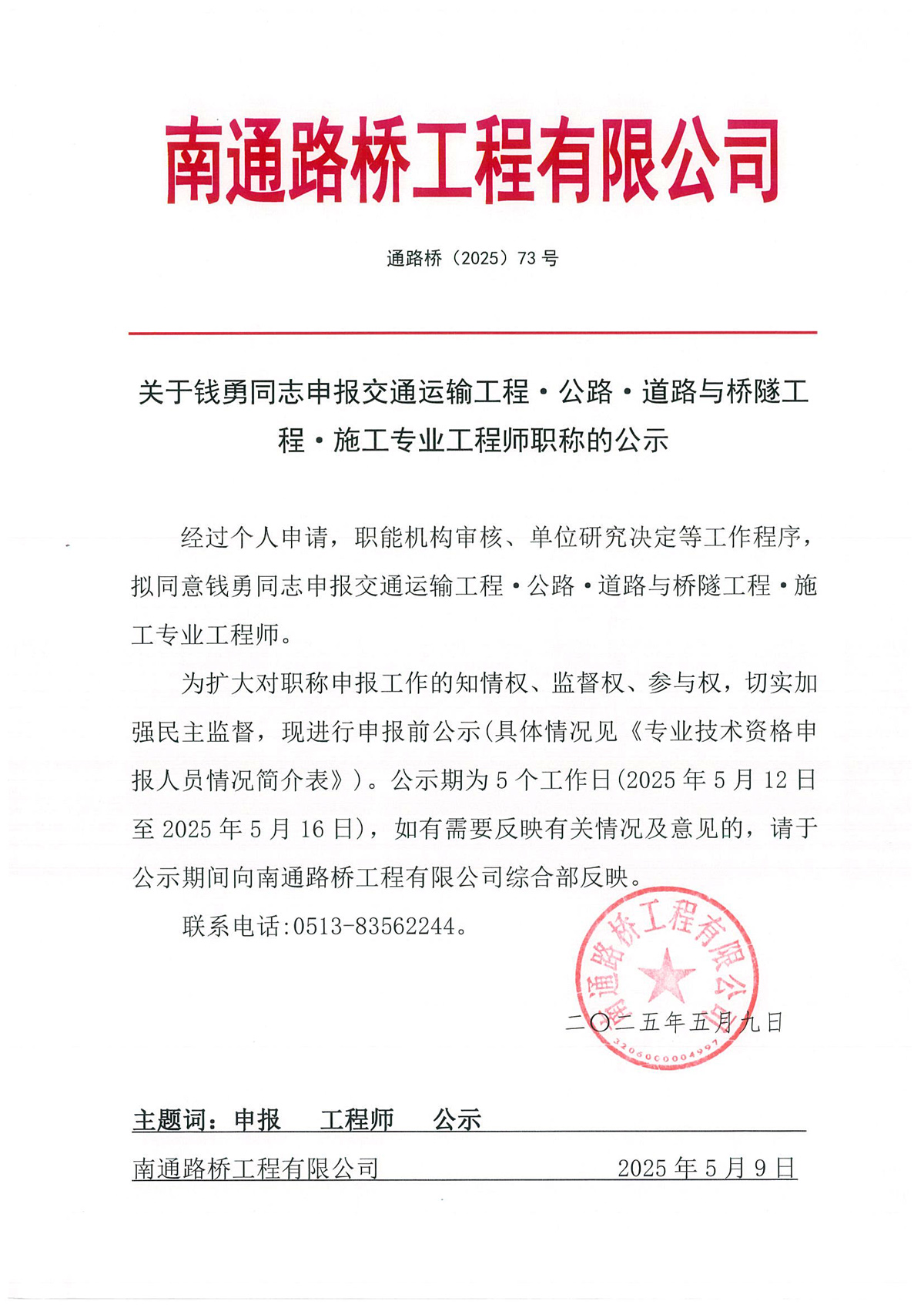 关于钱勇同志申报交通运输工程·公路·道路与桥隧工程·施工专业工程师职称的公示