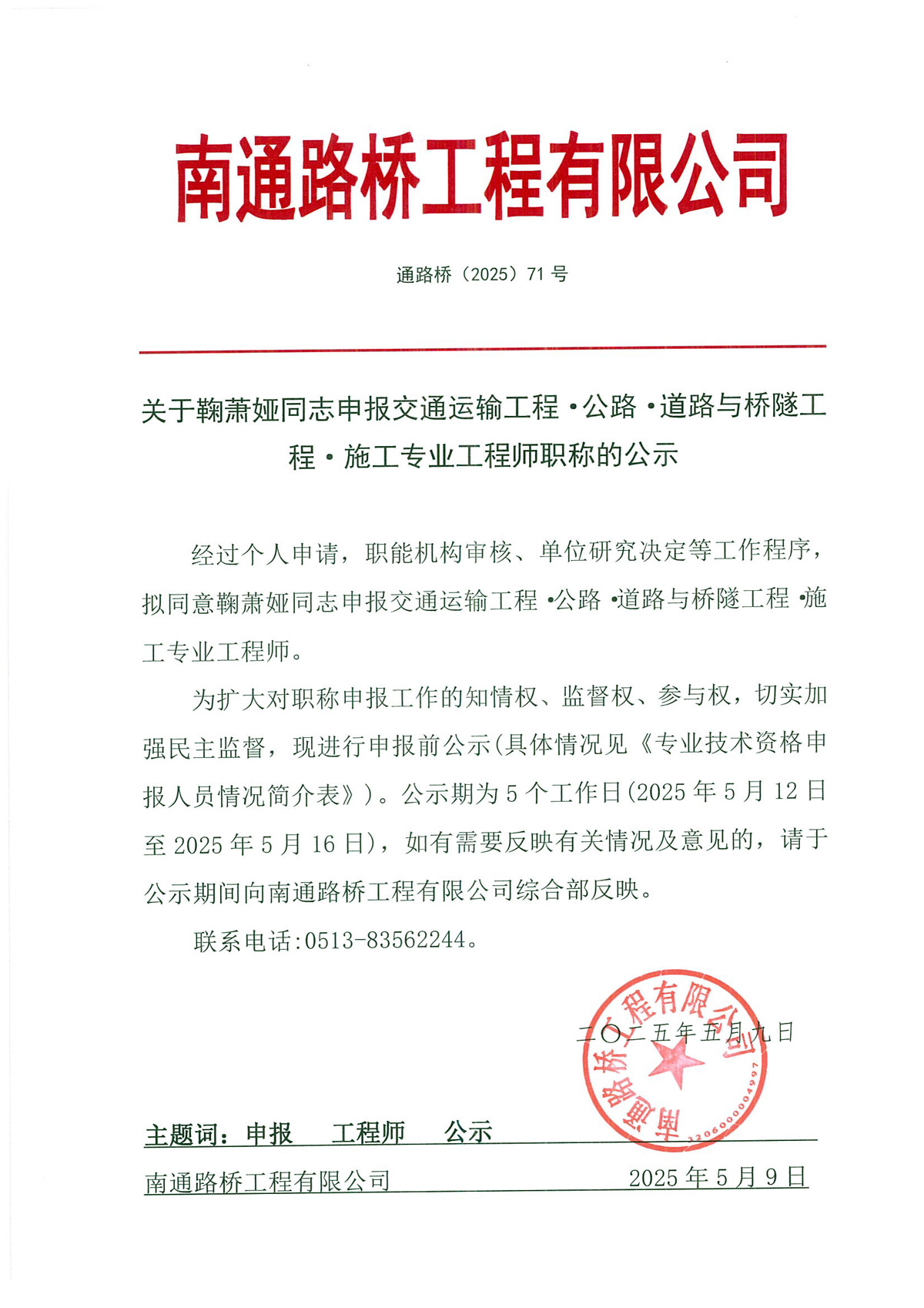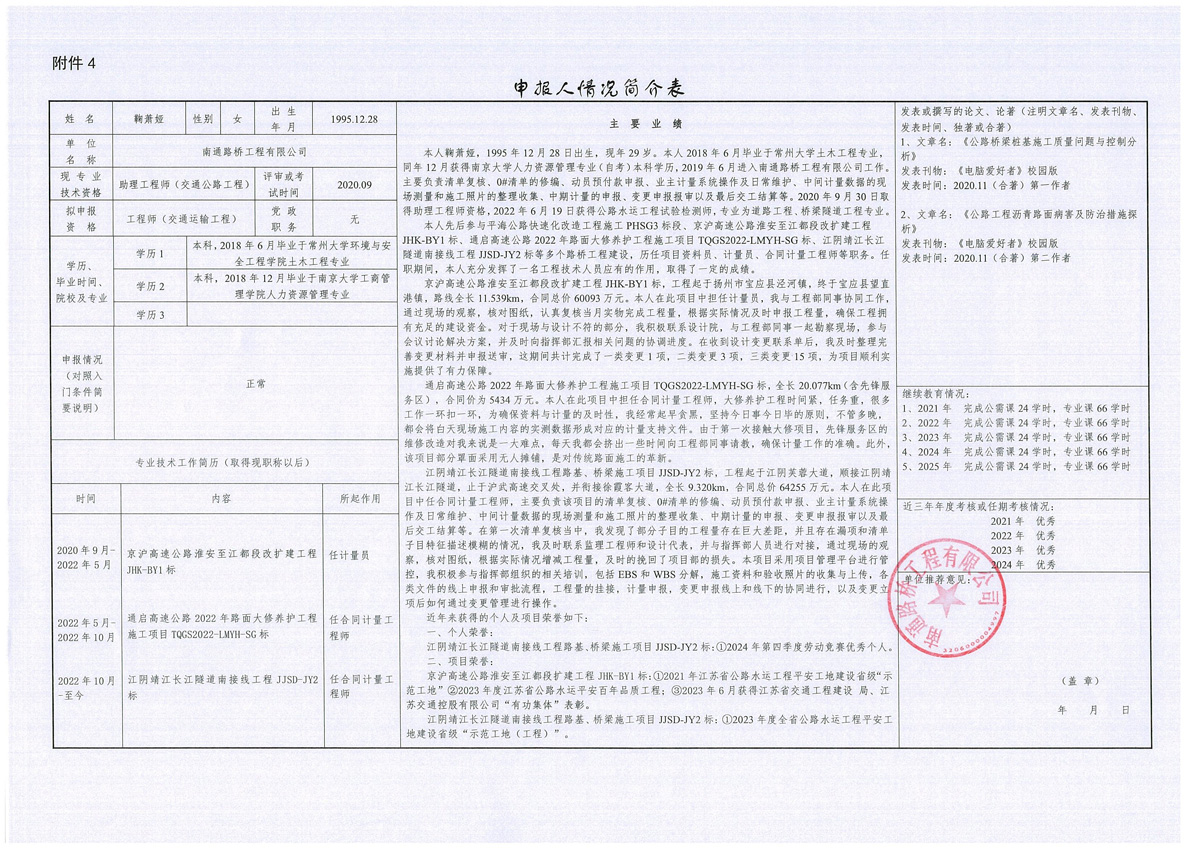 关于鞠萧娅同志申报交通运输工程·公路·道路与桥隧工程·施工专业工程师职称的公示