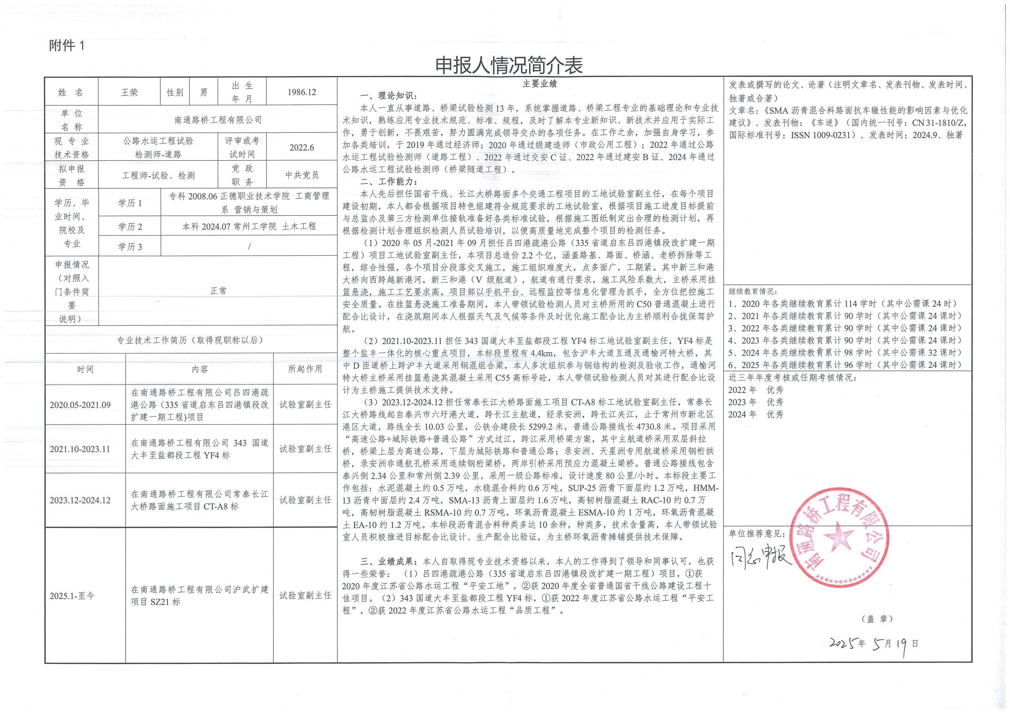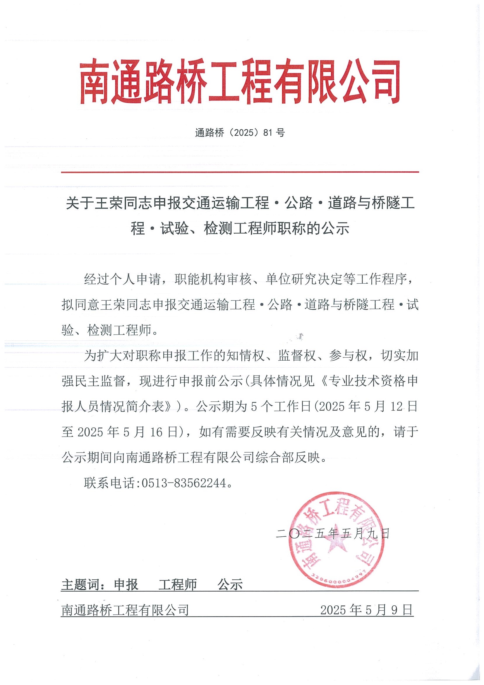 关于王荣同志申报交通运输工程·公路·道路与桥隧工程·试验、检测工程师职称的公示