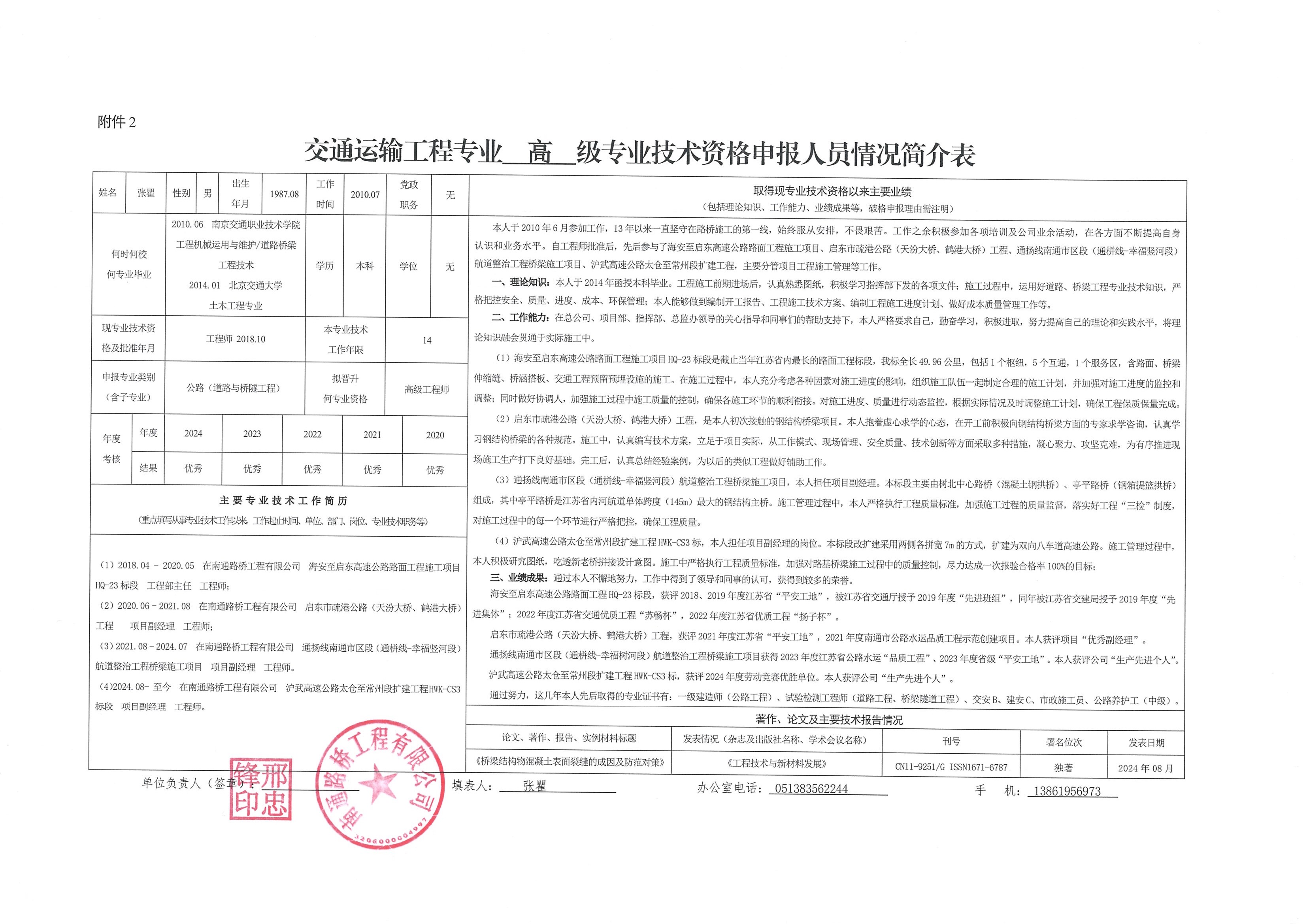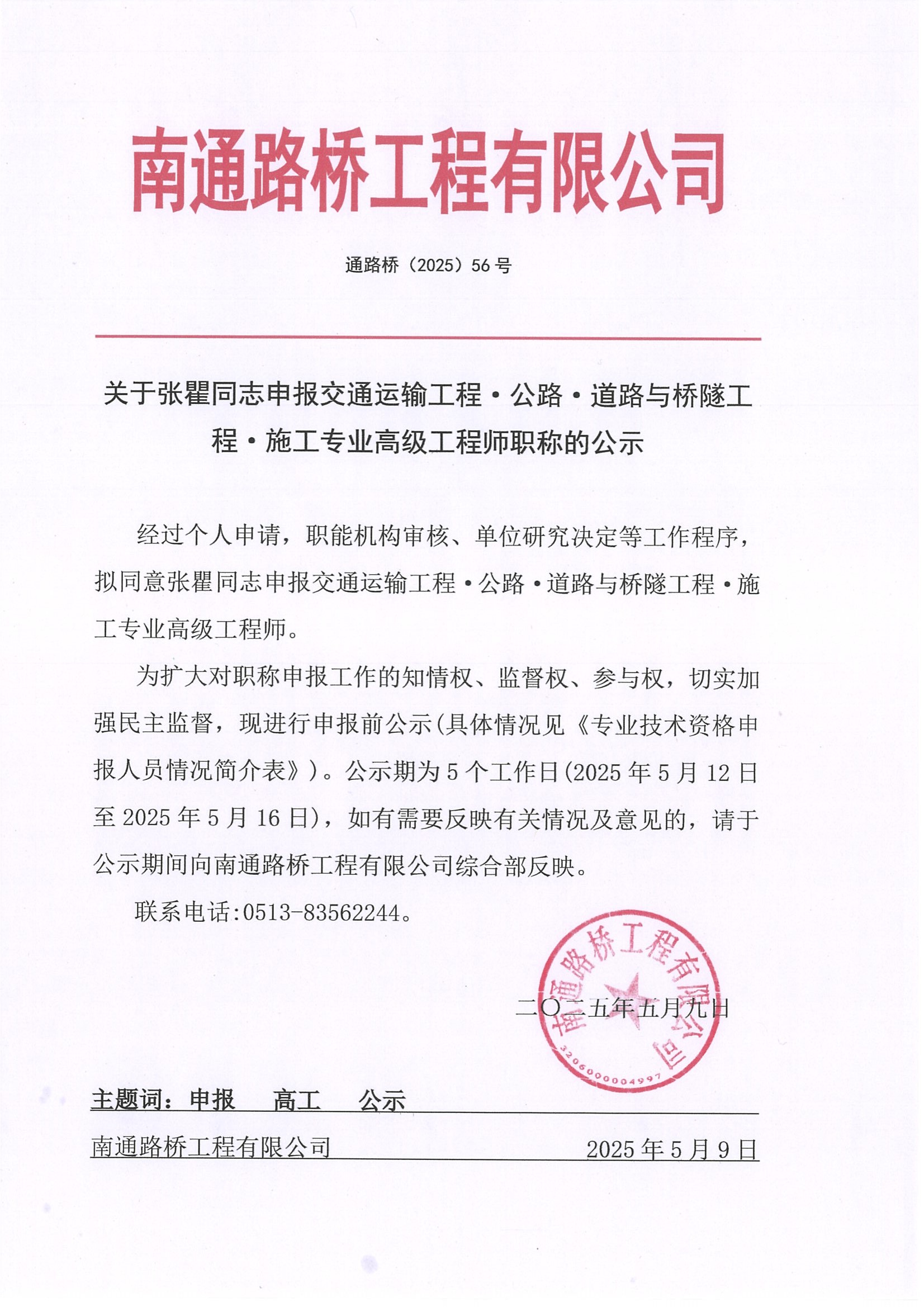 关于张瞿同志申报交通运输工程·公路·道路与桥隧工程·施工专业高级工程师职称的公示