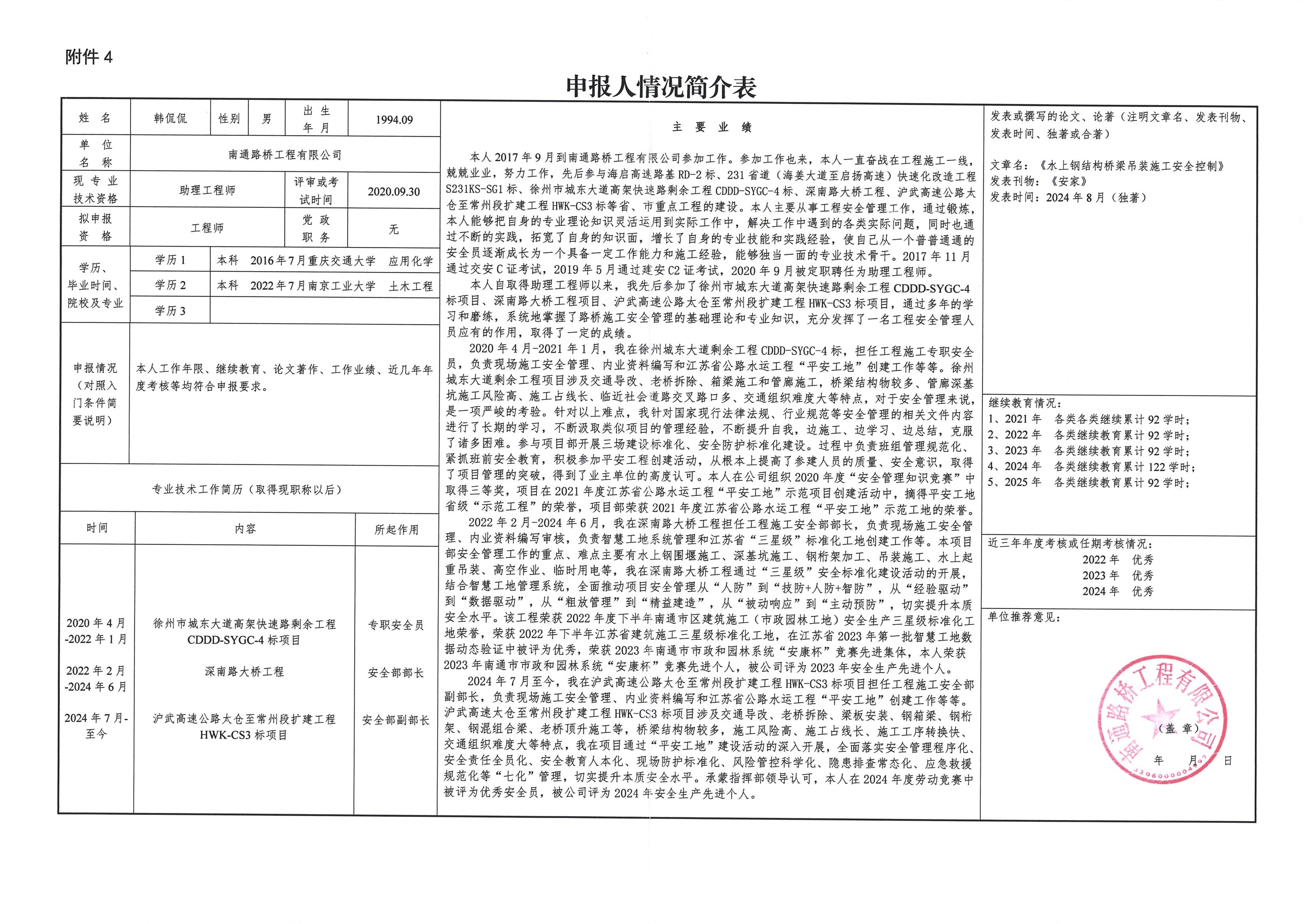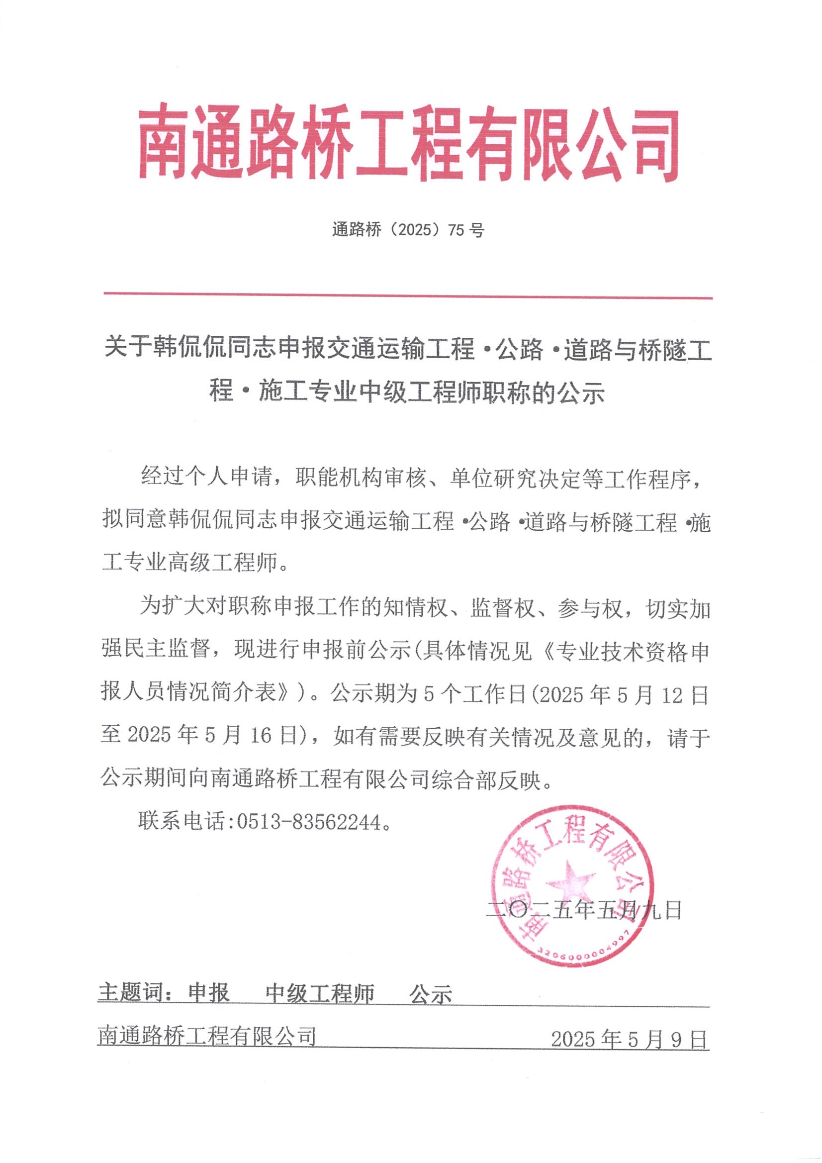 关于韩侃侃同志申报交通运输工程·公路·道路与桥隧工程·施工专业工程师职称的公示
