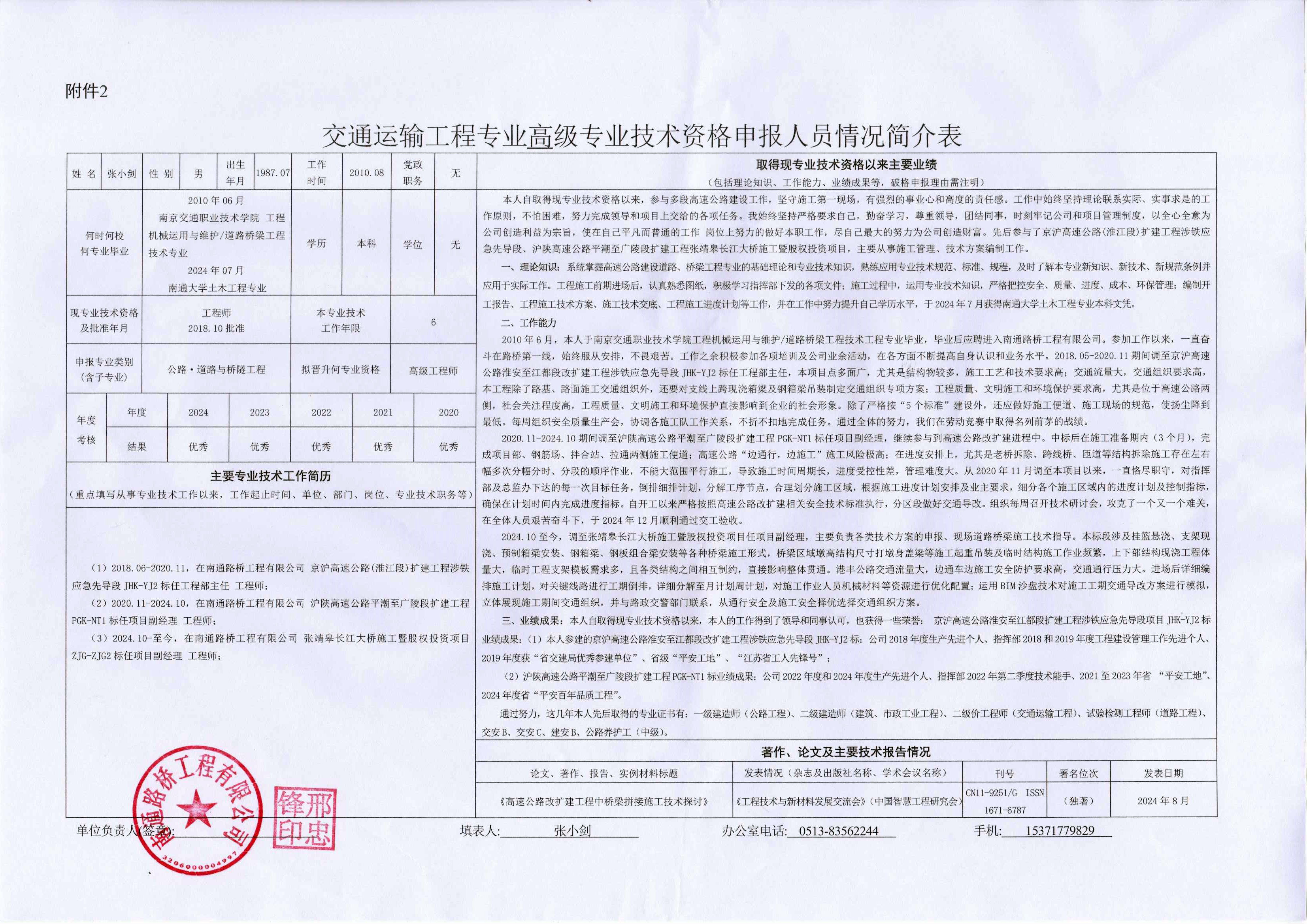 关于张小剑同志申报交通运输工程·公路·道路与桥隧工程·施工专业高级工程师职称的公示