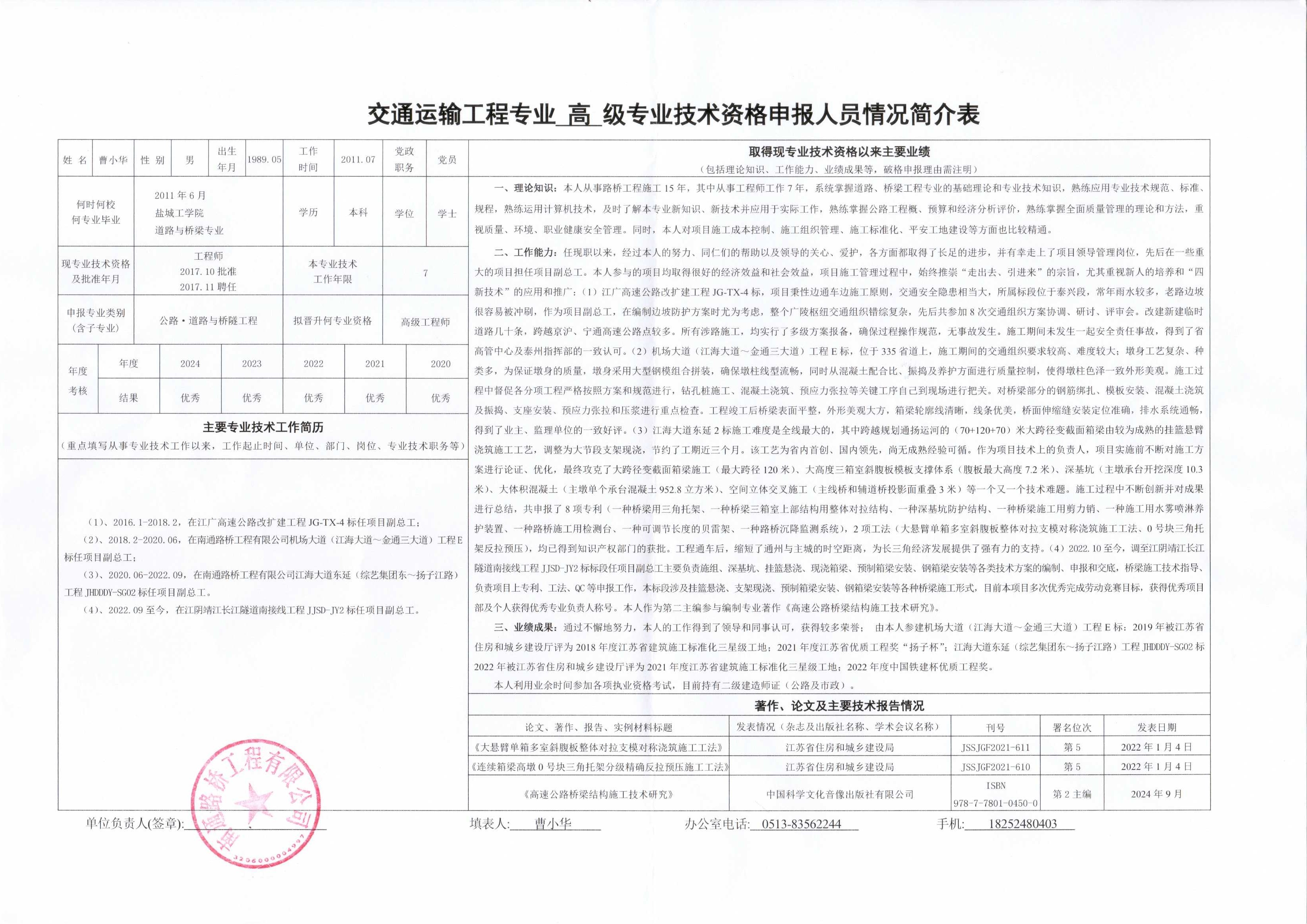 关于曹小华同志申报交通运输工程·公路·道路与桥隧工程·施工专业高级工程师职称的公示