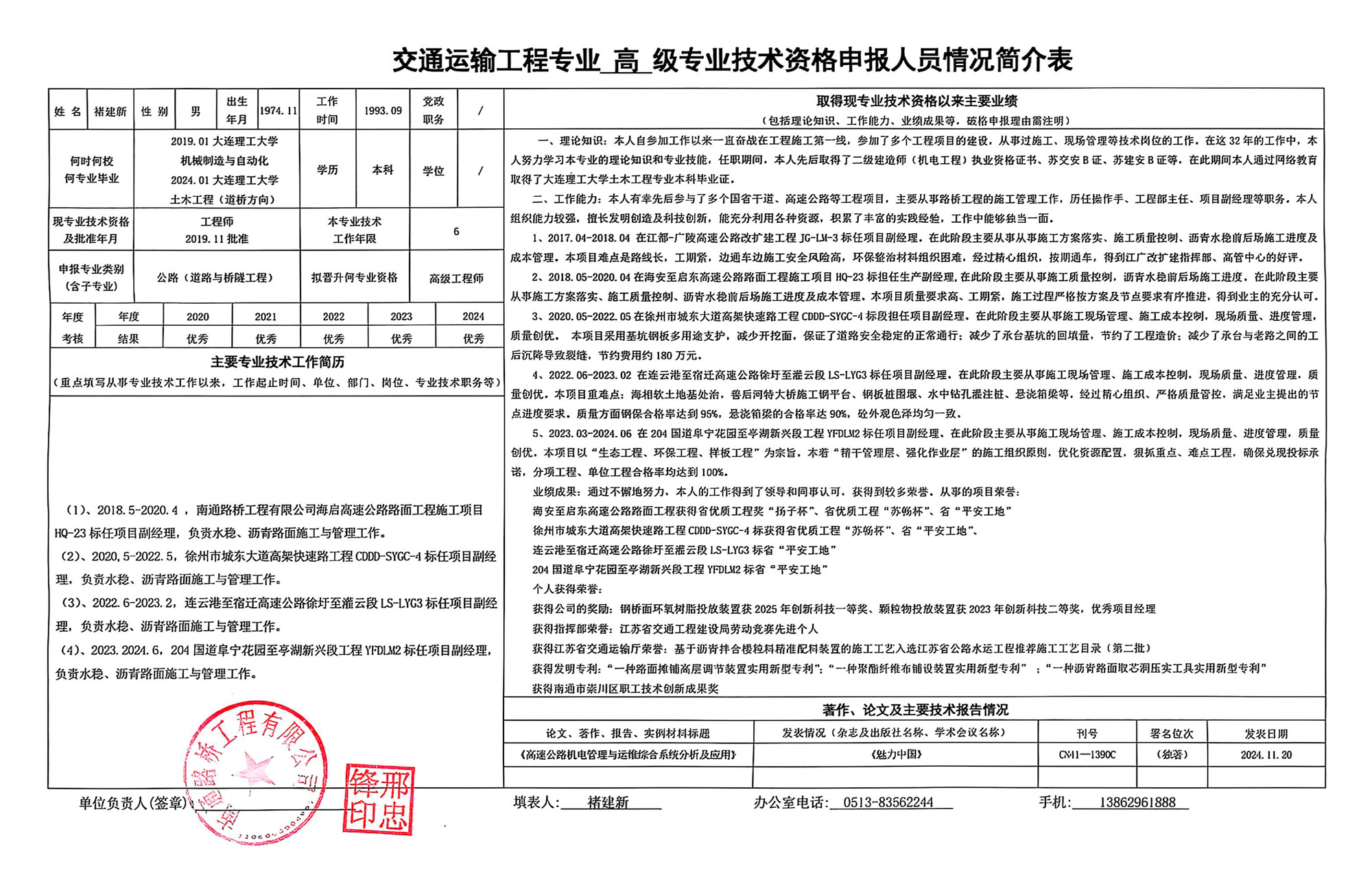 关于褚建新同志申报交通运输工程·公路·道路与桥隧工程·施工专业高级工程师职称的公示